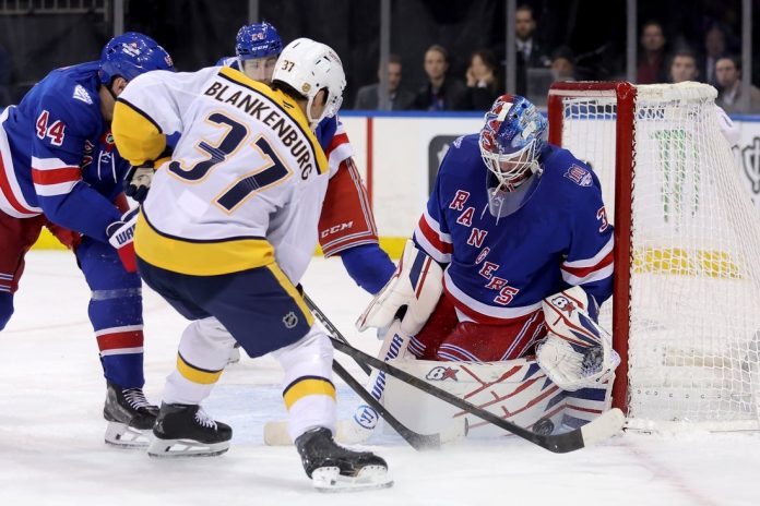 Artemi Panarin scored twice, Alexis Lafreniere finished with a goal and two assists and the New York Rangers ended their season-opening seven-game home winless streak by pulling away for a 6-3 victory over the Nashville Predators on Monday night.