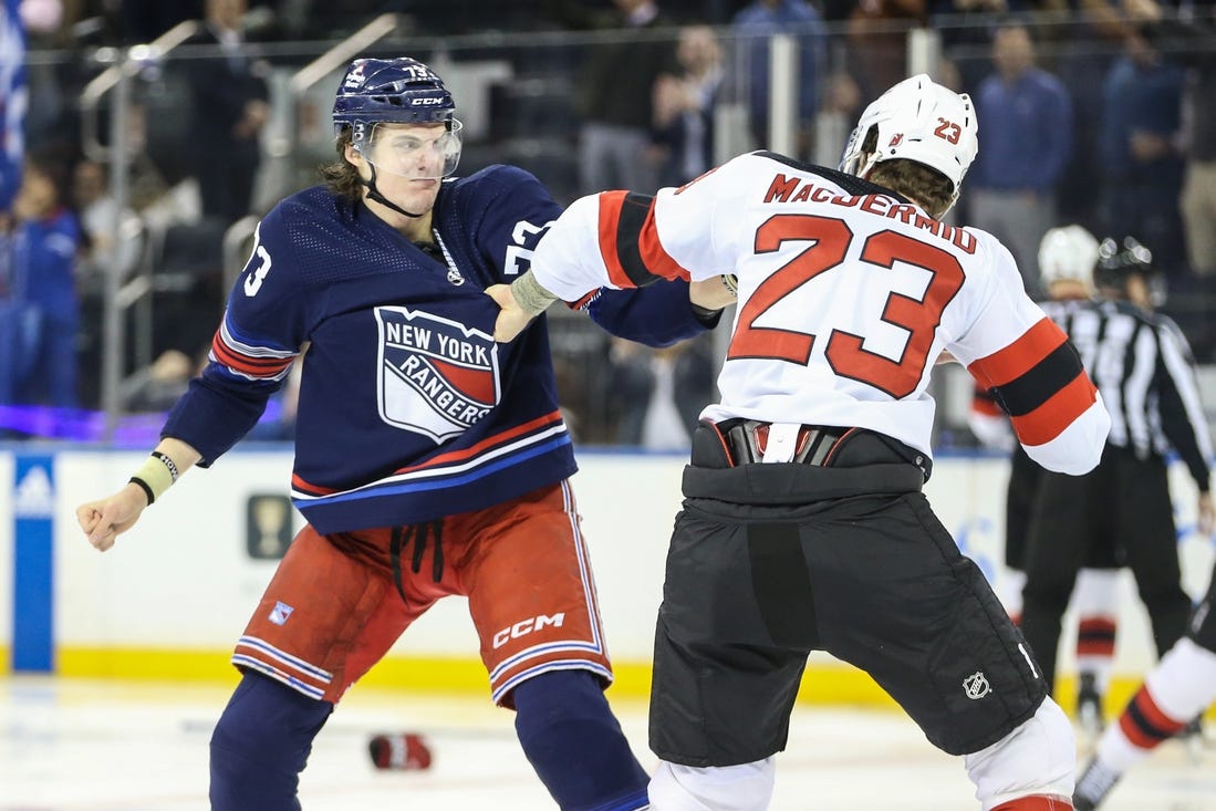 Before the scoring, both teams started their fourth lines and two seconds into the game there were five fights, highlighted by New York rookie Matt Rempe squaring off with New Jersey defenseman Kurtis MacDermid. Rempe and MacDermid were two of eight players given game misconducts once the ice was cleared.
