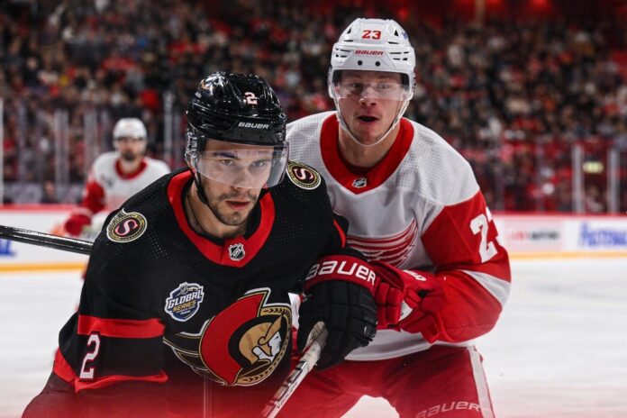 During a scramble in the Wings’ zone, Drake Batherson sent a pass that deflected off a defender’s stick. Stutzle took a waist-high whack at the puck as goaltender James Reimer ducked. The puck sailed over Reimer’s head and into the net.