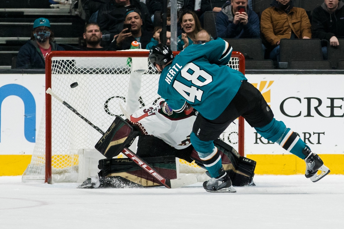 Logan Couture and Tomas Hertl each scored in regulation and again in the shootout as the San Jose Sharks overcame blowing a late two-goal lead to win 8-7 over the visiting Arizona Coyotes on Tuesday night.
