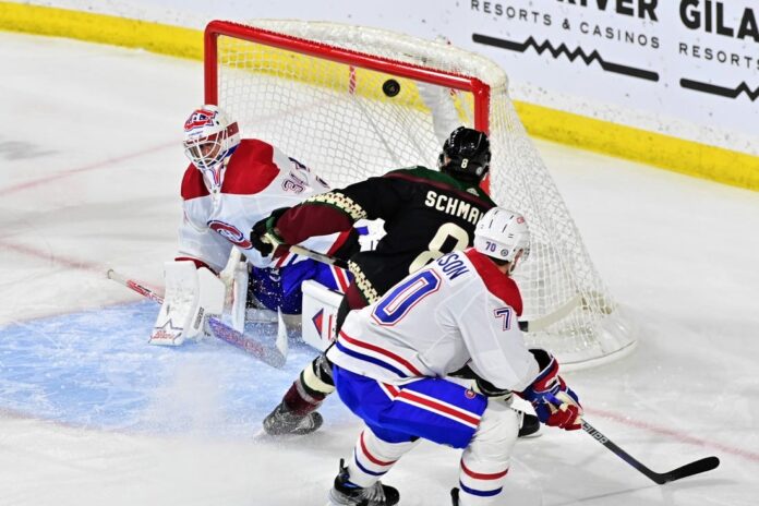 Arizona opened the scoring 6:17 into the game after earning a penalty shot when Montreal’s Justin Barron covered the puck with his hand in the crease. On his first career penalty shot, Schmaltz scored by lifting the puck over Jake Allen’s pad.