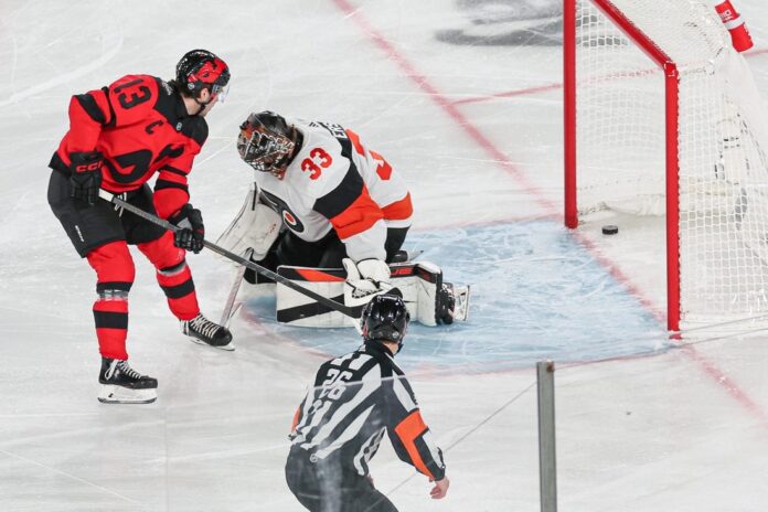 After Cam York’s clearing attempt deep in the defensive zone banked off an official’s skate, Ondrej Palat chipped the puck to Hischier. He sped up ice, moved past Sean Couturier and slipped a backhander under Ersson’s pads.