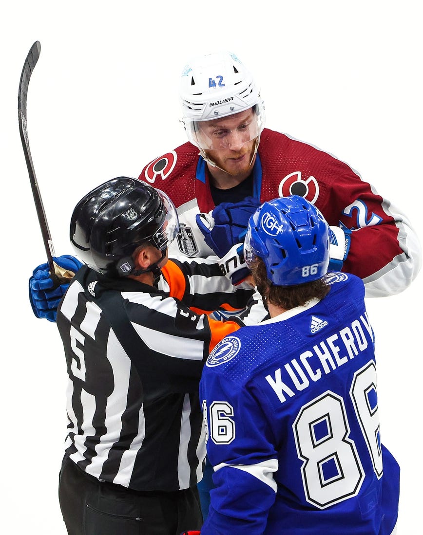 Tampa Bay Lightning star Nikita Kucherov left Game 3 of the Stanley Cup Final on Monday with six minutes remaining after falling awkwardly following a penalized crosscheck from Devon Toews of the Colorado Avalanche.