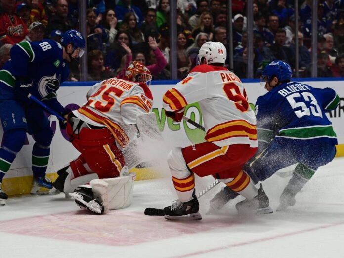 Nils Hoglander scored twice to pace the host Vancouver Canucks to a 4-2 victory over the Calgary Flames on Saturday.