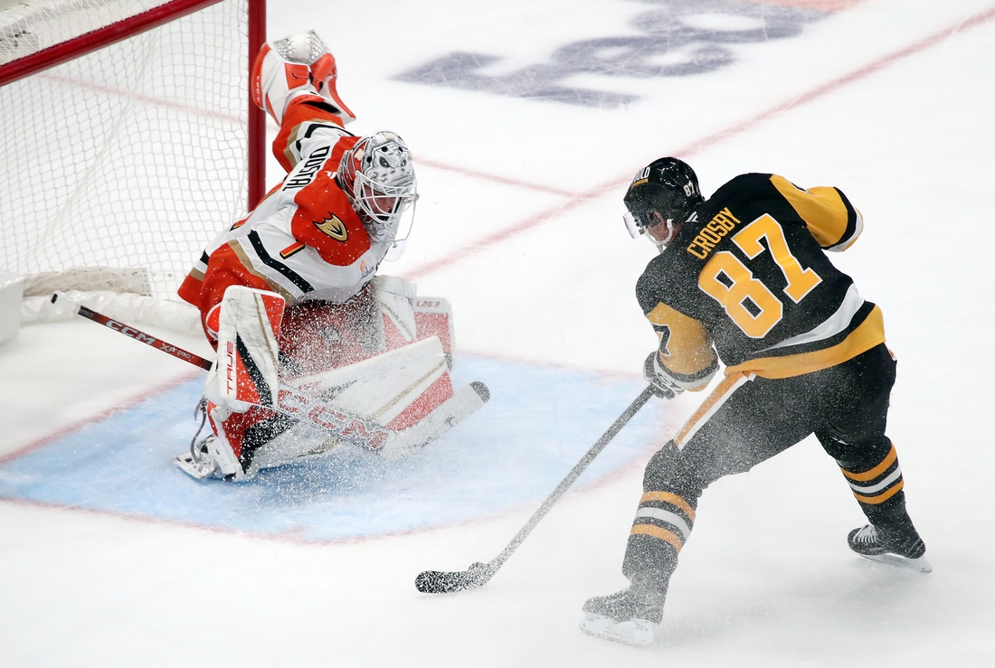 Captain Sidney Crosby scored twice, including the overtime winner, as Pittsburgh edged the Anaheim Ducks 2-1 on Thursday night.