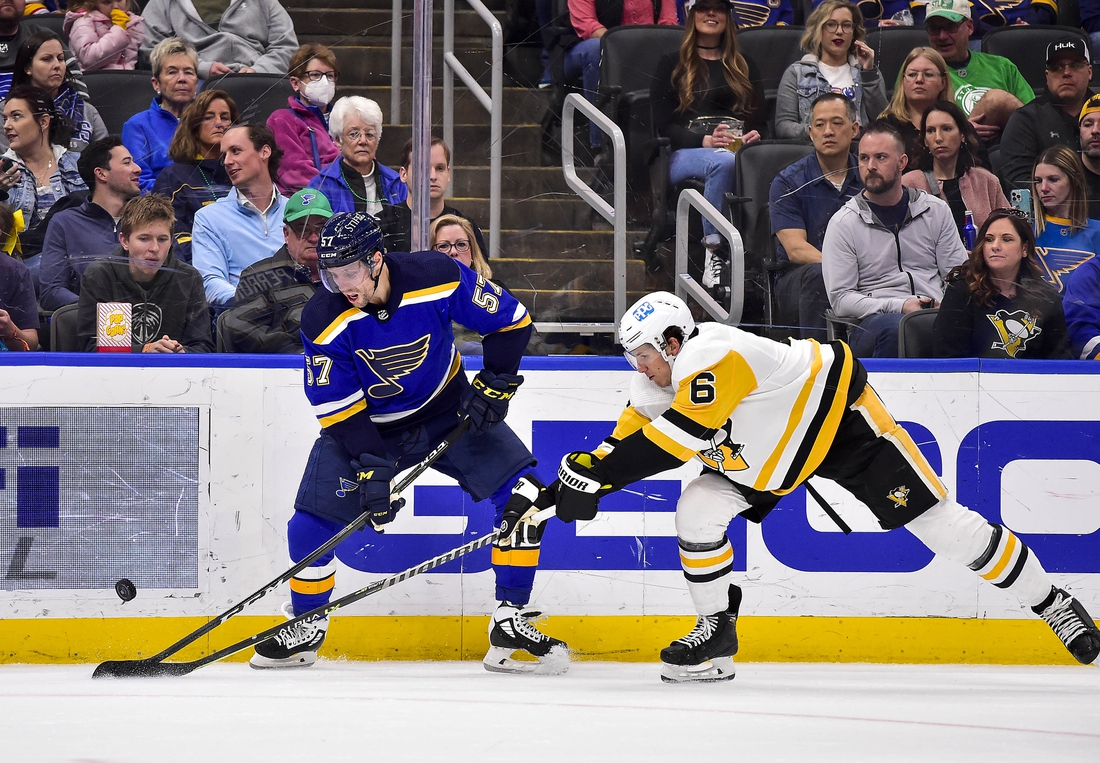 The Penguins controlled much of the second period while outshooting the Blues 17-6.
