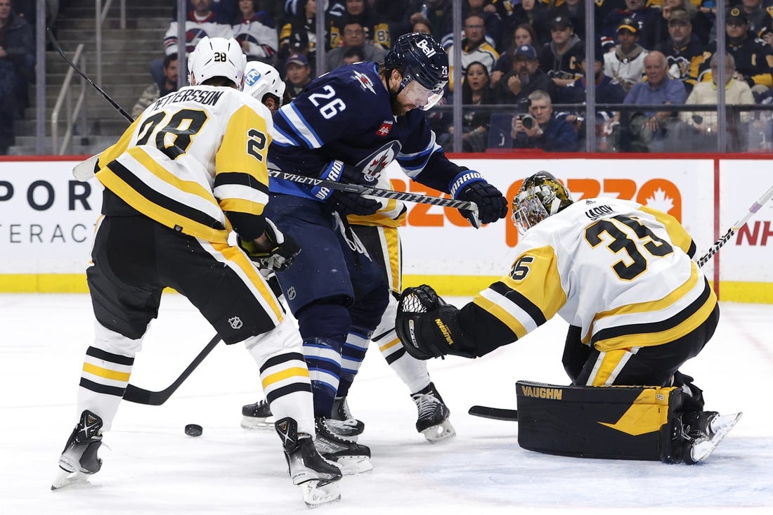 Connor Hellebuyck finished with 29 saves for the Jets, who fell to 8-2-1 in their last 11 games overall and saw their five-game home winning streak come to a halt. Hellebuyck has dropped to 3-5-3 in his career versus Pittsburgh.