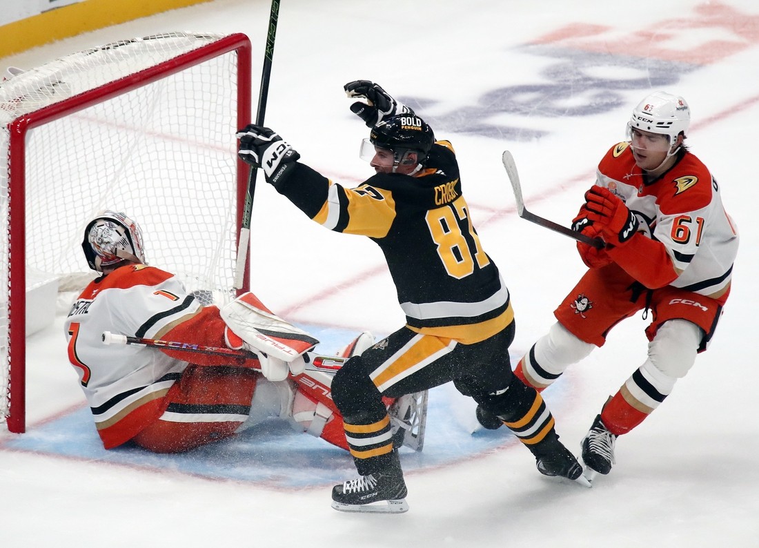 Sidney Crosby scored his second goal of the game at 2:35 of overtime to lift the Pittsburgh Penguins to a 2-1 win against the visiting Anaheim Ducks on Thursday night.
