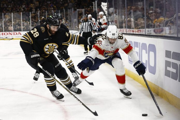 Pavel Zacha’s blind backhand pass allowed Florida to maintain offensive-zone possession and score the opening goal 8:04 into the first period. Gustav Forsling took a shot from above the left circle that Rodrigues deflected over Swayman’s shoulder from the doorstep.