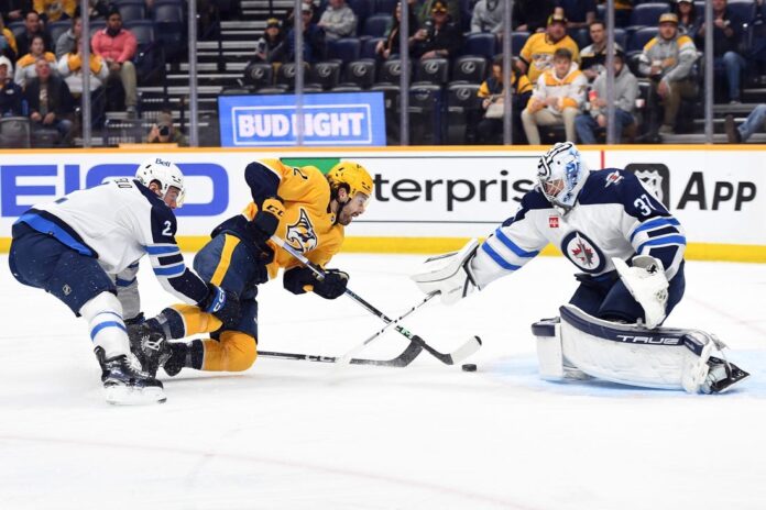 Nashville opened the scoring 4:05 into the game. Novak took advantage of a Winnipeg turnover and drove to the net, sliding the puck past Hellebuyck for his 16th of the season.