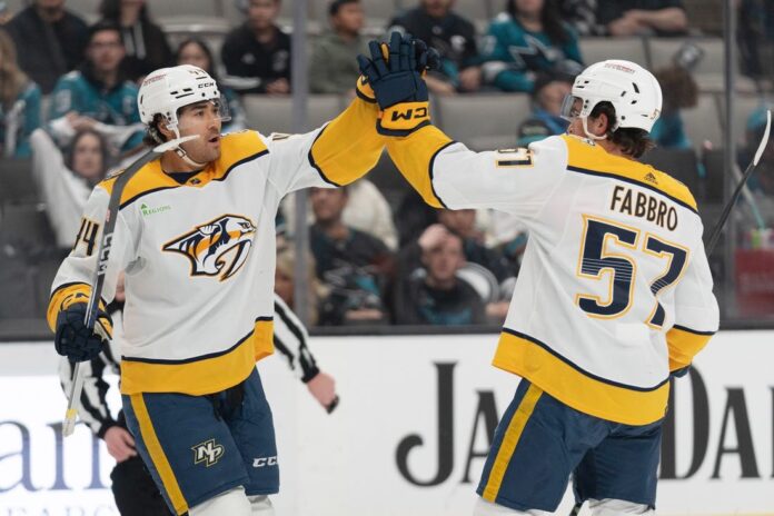 Gustav Nyquist and Filip Forsberg each had a goal and an assist for Nashville, which moved two points ahead of both St. Louis and Minnesota for the final wild-card spot in the Western Conference. It was Nashville’s ninth consecutive win over the Sharks.