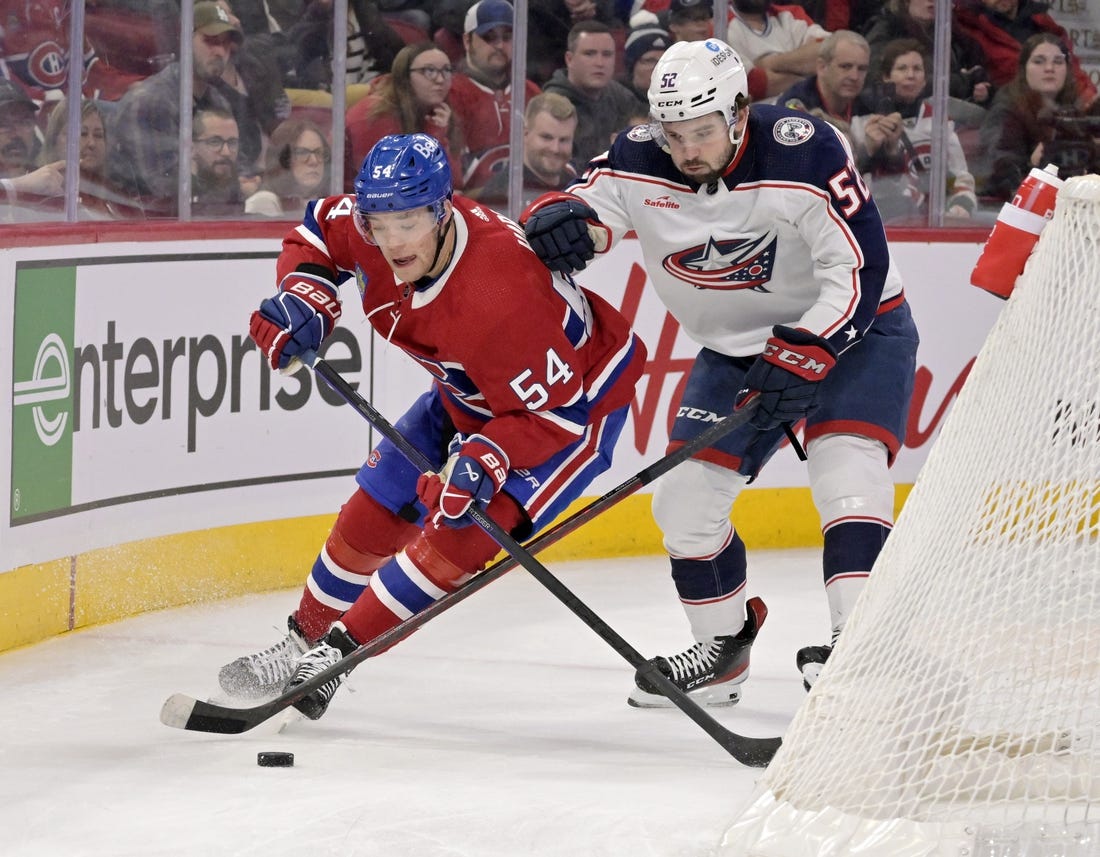 Harvey-Pinard scored 13 seconds in to put the home side ahead 3-2. Matheson drove to the net and got a shot on Merzlikins but the puck was loose behind him and Harvey-Pinard pushed it in.