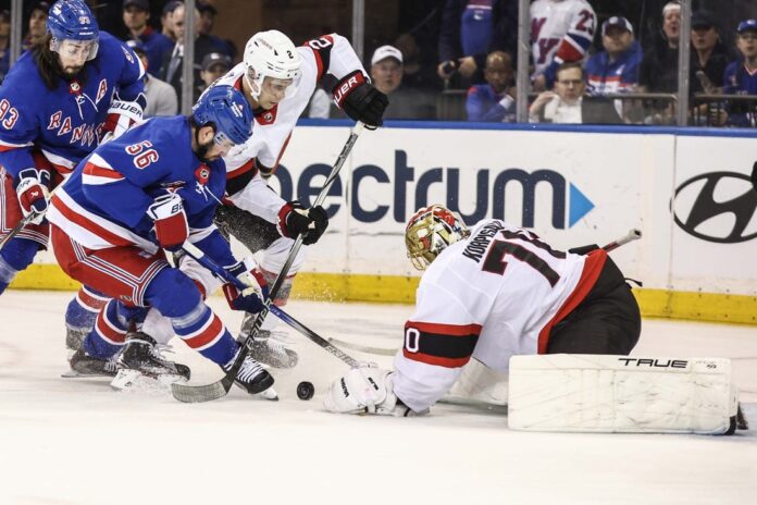 The Rangers went ahead 5:55 into the contest thanks to Roslovic’s defensive play. He forced Ottawa defenseman Artem Zub into a neutral zone turnover and scored his sixth goal with the Rangers by getting to the right side of the crease and lifting the puck over Korpisalo’s glove to finish off a two-on-one with Chris Kreider.