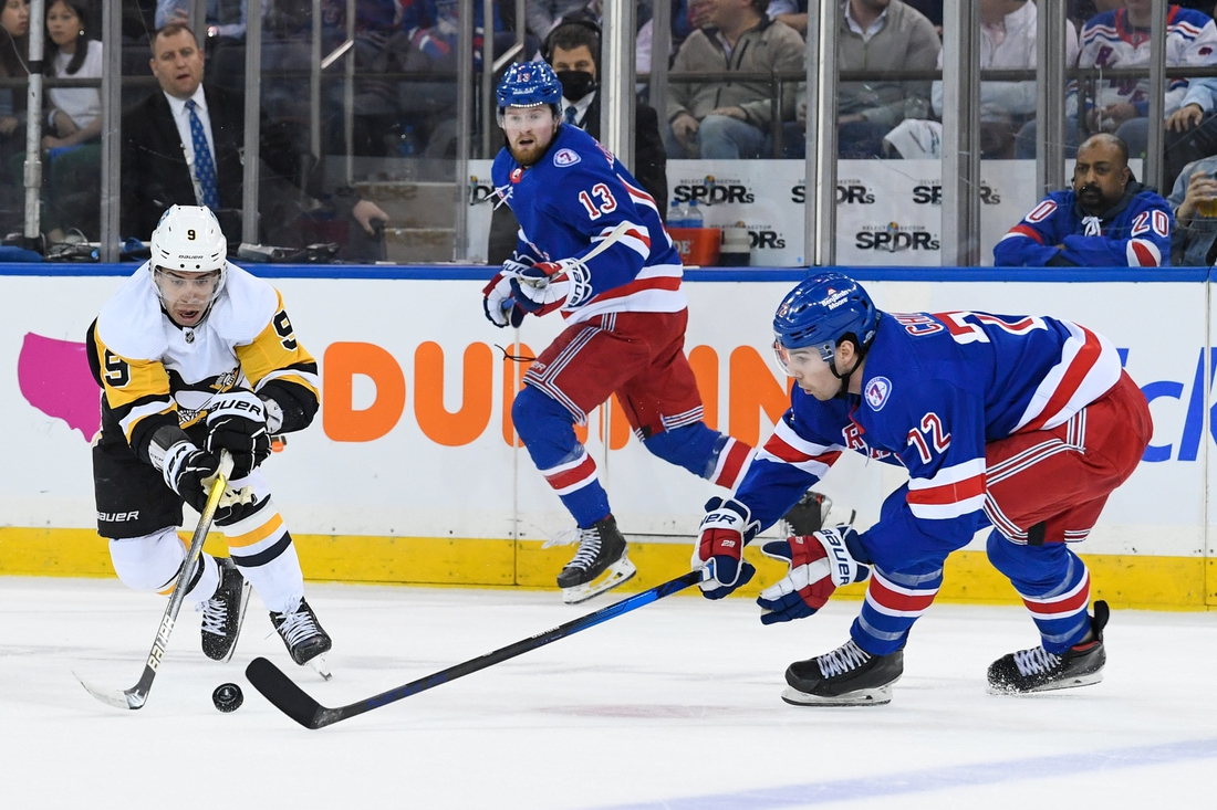 The Rangers regained the lead 2:59 into the second on a power play. Strome held off Kris Letang in front of the net and deflected Adam Fox’s long shot under Domingue.