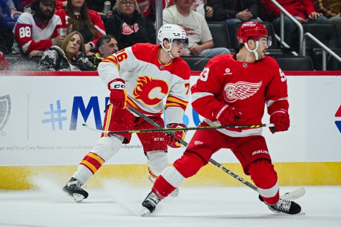 The Red Wings scored on their first power play at 6:33 of the opening period after Calgary’s Matt Coronato was penalized for tripping. Stationed near the goal post, Michael Rasmussen passed the puck to the left circle, where DeBrincat one-timed it past Vladar’s stick. Raymond had the second assist.