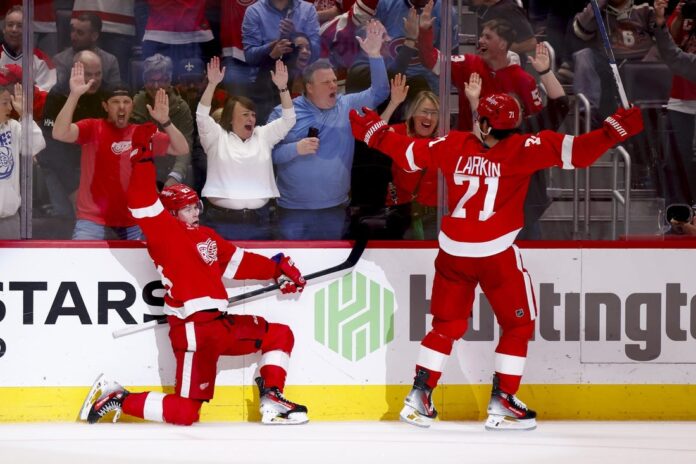 The Red Wings pulled goalie Alex Lyon (17 saves) with 2:20 remaining and, after extensive pressure in the Montreal zone, tied the game at 4-4 with 1:17 left when Raymond got free in front of Montembeault (30 saves) and beat him glove side.
