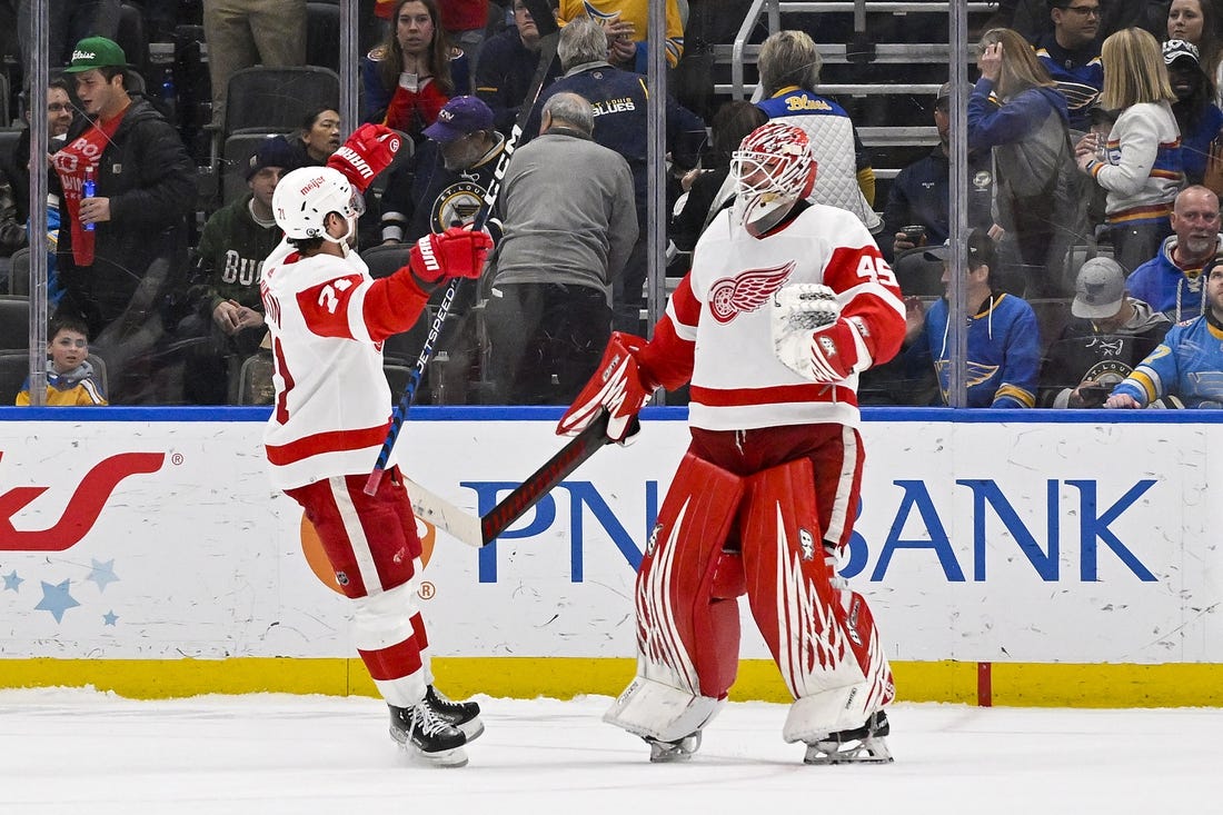 Lucas Raymond and Magnus Hellberg lifted Detroit to a shootout victory at St. Louis on Tuesday. The Red Wings will look to make it two wins in a row when they host the Blues on Thursday.
