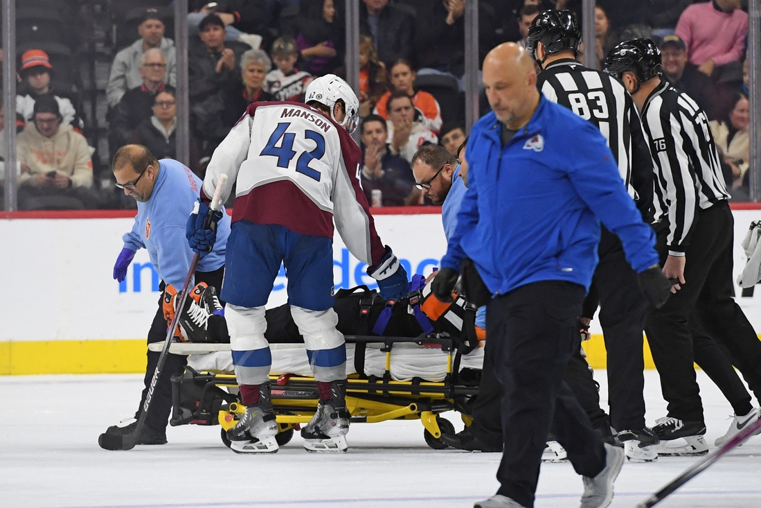 Referee Mitch Dunning had to be taken off the ice via stretcher during the first period of a meeting between the host Philadelphia Flyers and Colorado Avalanche on Monday night.
