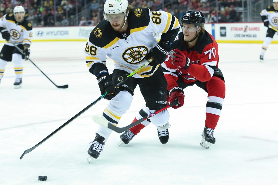 On Friday in Newark, N.J., David Pastrnak scored two of Boston’s four second-period goals and Linus Ullmark made 37 saves to help the Bruins defeat the Devils. Patrice Bergeron and Jake DeBrusk also scored for Boston, which carried a 4-1 lead into the third period.