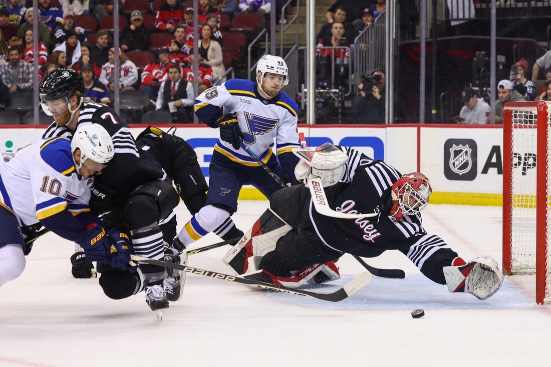 With the game tied at 2-2, the Devils failed to clear their zone and the puck eventually found Saad, who beat New Jersey’s Akira Schmid (14 saves), called up earlier in the day from Utica of the AHL, just 2:27 into the third period. The Blues made it a two-goal game when Thomas one-timed an angled shot behind Schmid for a power-play strike with 10:07 to go in regulation.