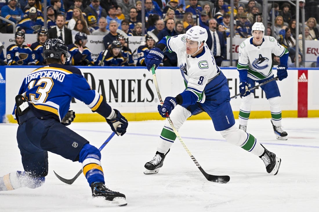 Vancouver struck 1:57 into the game. After Demko stopped Blues winger Jake Neighbours stepping out from behind the net, Garland put the Canucks up 1-0 at the other end.