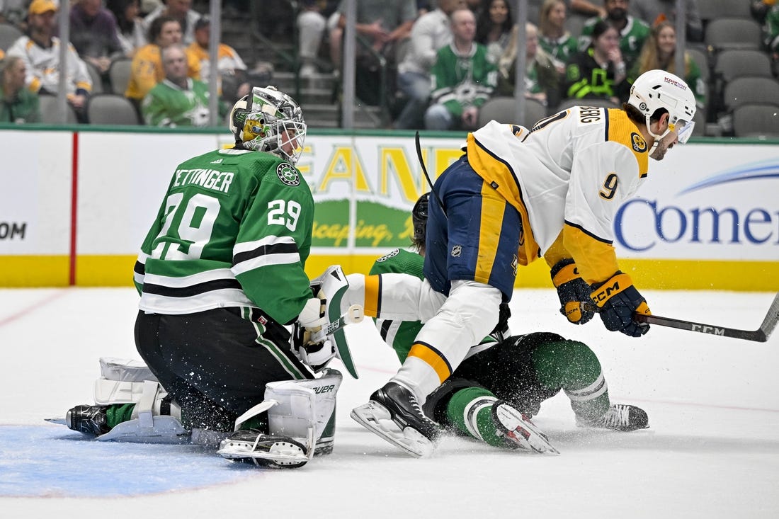 Dallas jumped out to a 1-0 lead at the 4:46 mark of the first period on a shorthanded goal. Hintz had just jumped off the bench and snuck up behind Roman Josi at the left point where he poke-checked the puck away to Heiskanen, who sprung Hintz on a breakaway. Hintz then fired a wrist shot past Saros into the top left corner.