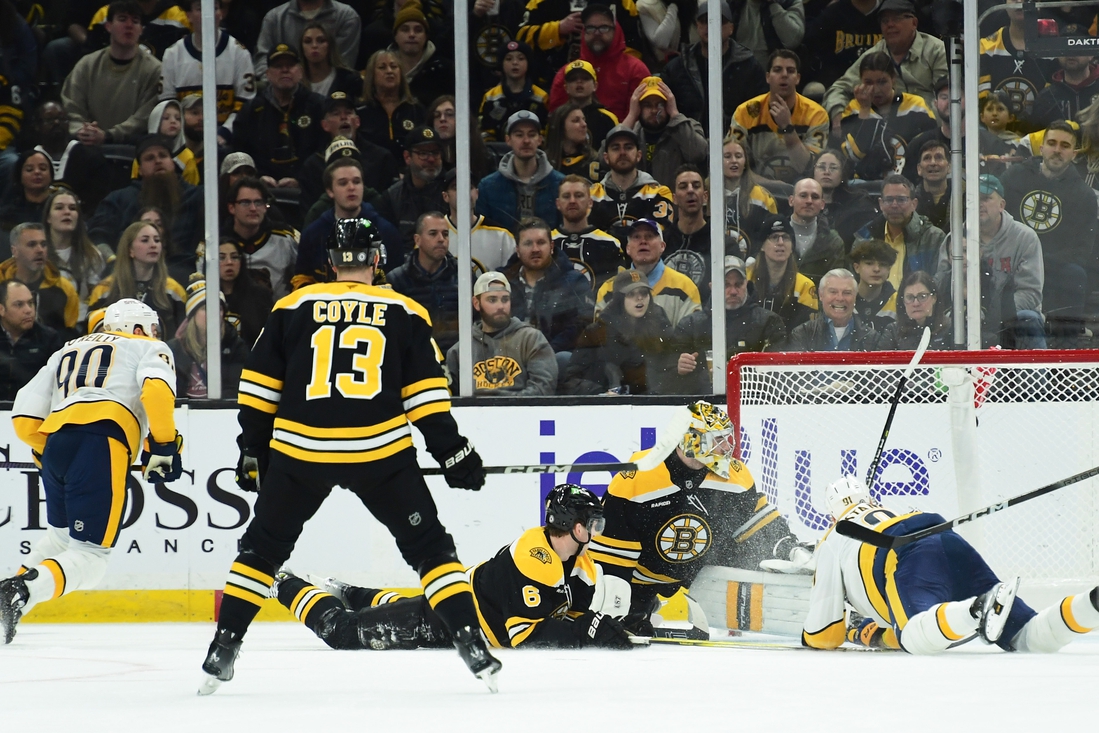 Nashville turned the period around from there, with Novak scoring an unassisted tying goal just 1:07 later. He capitalized on Zacha’s turnover and beat Swayman with a wrist shot from the right circle.