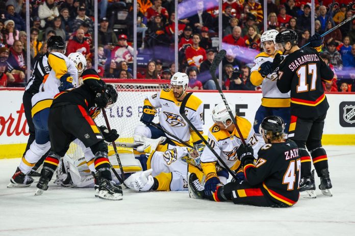 However, Svechkov restored Nashville’s two-goal edge at 9:19 of the third period when he was quick to grab the puck after a face-off in Calgary territory and tucked it past Wolf.