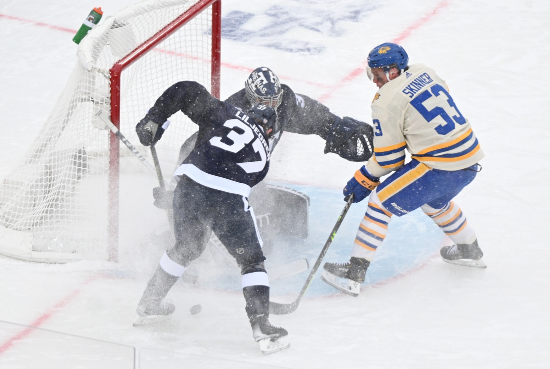 Vinnie Hinostroza and Peyton Krebs each scored twice, and the Buffalo Sabres defeated the visiting Toronto Maple Leafs 5-2 Sunday afternoon in the NHL Heritage Classic in Hamilton, Ont.