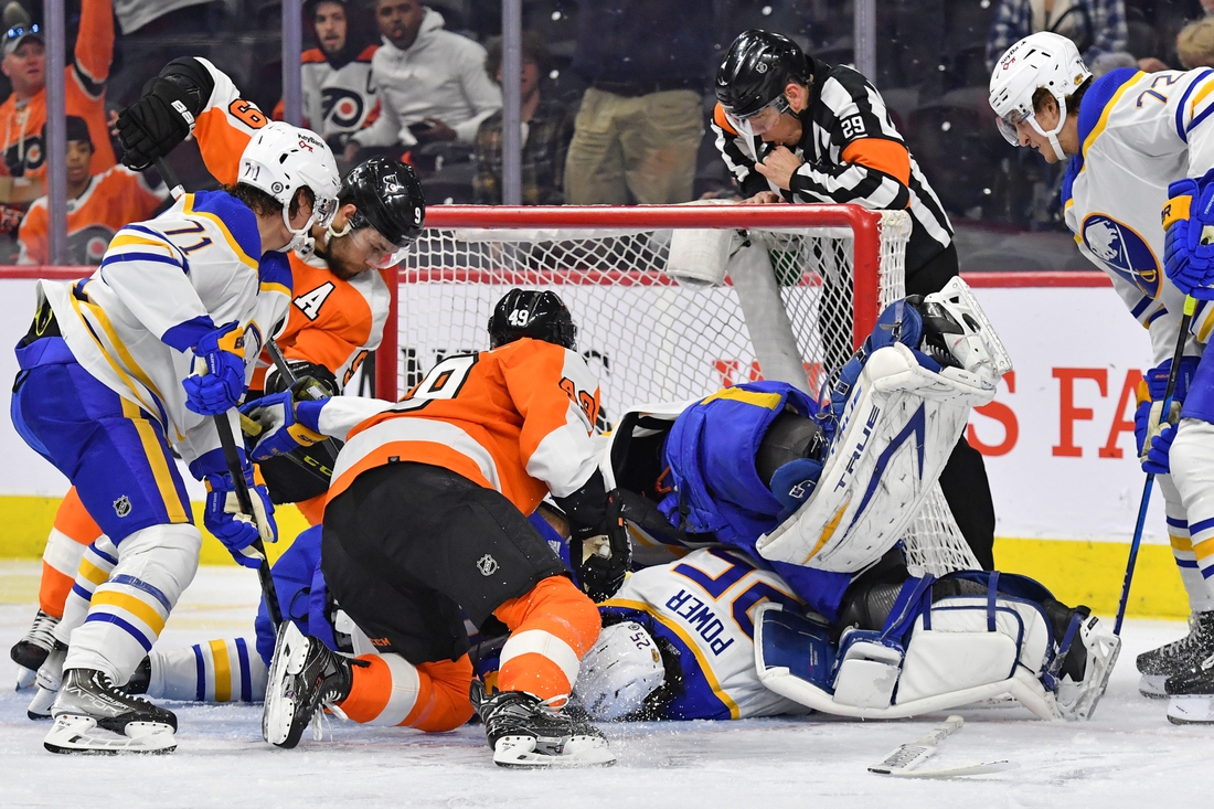 Cates tied it 2-2 off a scramble in the crease at 1:20 of the second period. Officials called a penalty shot for the Flyers after Power covered the puck in the crease, but video review showed the puck hit Power’s knee and crossed the goal line before he covered it.