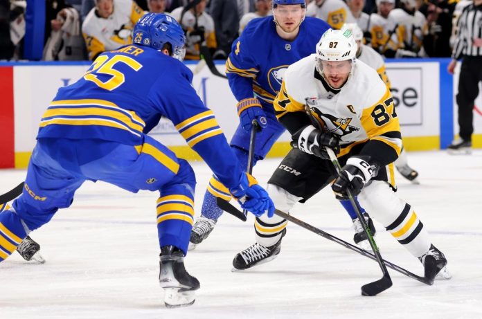 Sidney Crosby scored to set an NHL record with his 20th season averaging at least one point per game. Blake Lizotte and Kevin Hayes also scored for the Penguins (29-34-11, 69 points), who have lost three in a row.