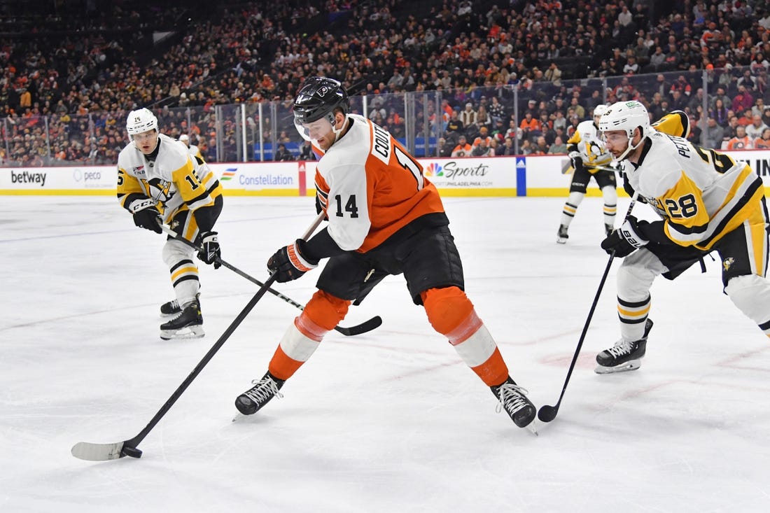 Sean Couturier scored at the 3:55 mark of overtime to lift the host Philadelphia Flyers past the Pittsburgh Penguins 2-1 on Monday.