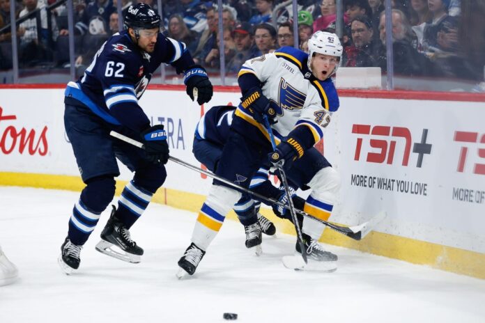Connor connected on a partial breakaway to extend Winnipeg’s lead to 3-1 at 15:33. Morrissey knocked away a Blues pass attempt on an odd-man rush and directed it into the neutral zone, where Connor collected it before driving up the left wing and scoring far side from the circle.