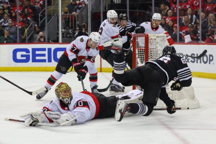Drake Batherson cut to the front of the net after a New Jersey turnover and lifted a backhander over Allen to extend it to 5-2 at 10:15 of the third period.