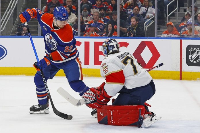 Sergei Bobrovsky pitched a 21-save shutout for the visiting Florida Panthers in a 4-0 win over the Edmonton Oilers on Thursday night in a rematch of the Stanley Cup Final in each of the two previous seasons.