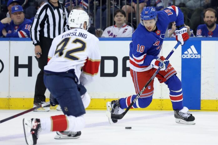 The Panthers constantly hounded the Rangers into misplaying the puck and scored after Gustav Forsling forced Artemi Panarin into a turnover. As Panarin was about to set up a shot from the right faceoff circle, he lost it to Forsling, who quickly moved the puck through the neutral zone and into the Florida zone.