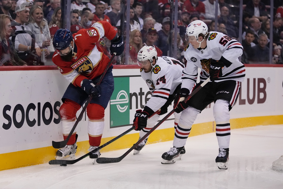 Florida’s third goal, at 11:46 of the second, came on a long rebound to Forsling in the high slot. The low shot went under the stick of Delia, who had little visibility as Florida’s Sam Bennett and Chicago’s Caleb Jones crashed to the ice right in front of the goal.
