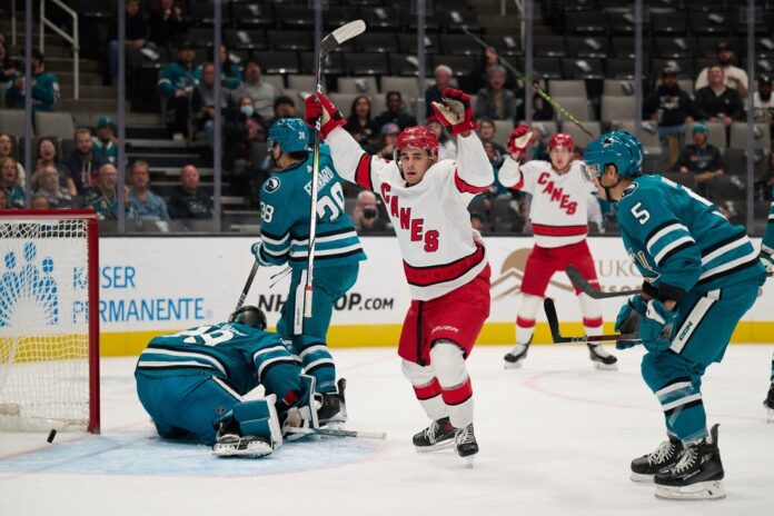 Seth Jarvis scored two goals to help the visiting Carolina Hurricanes rally for a 6-3 win over the San Jose Sharks on Tuesday night.