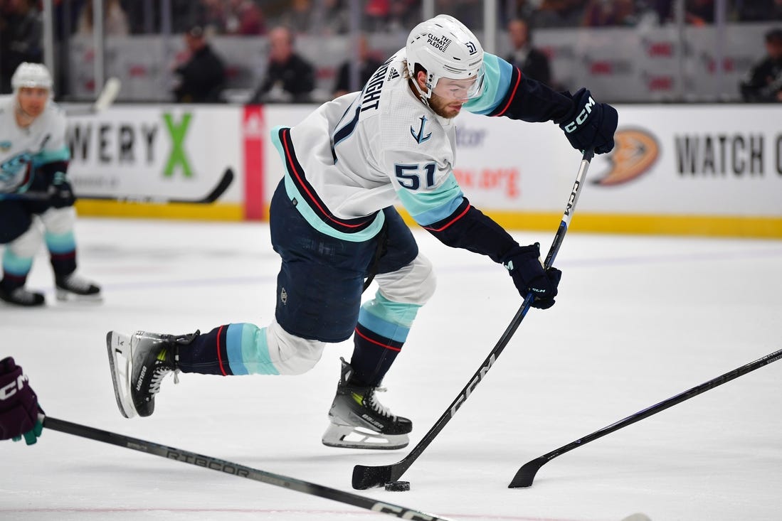 Wright tallied again at 2:29 of the second. Linemate Jaden Schwartz corralled the puck behind the Anaheim net and found an open Wright in the slot. Wright snuck a shot between Dostal’s body and the right post.