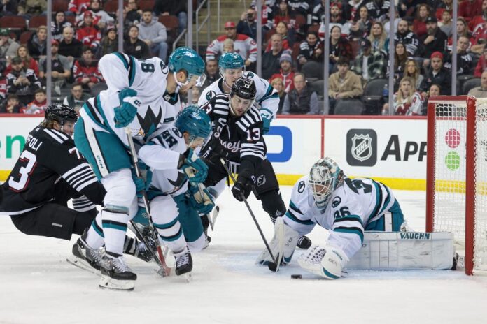 Anthony Duclair scored twice, Jacob MacDonald had his first career two-goal game and the San Jose Sharks overcame a significant shot disparity to snap a season-opening 10-game road losing streak with a 6-3 victory over the New Jersey Devils on Friday night in Newark, N.J.