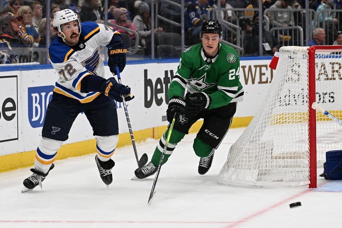 Wyatt Johnston had a goal and an assist for the visiting Dallas Stars as they defeated the St. Louis Blues 4-1 Monday.