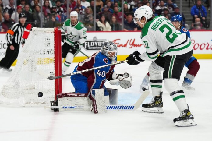 Both teams had chances in a tight-checking first period. Dallas winger Evgenii Dadonov’s backhander at a wide-open net went off the outside of the post. In the final minute, Colorado’s Artturi Lehkonen nearly scored on a rebound, but Oettinger got a pad on it and Dadonov kept it out of the net.