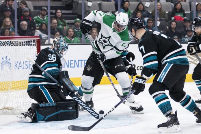 San Jose held a 2-0 lead until the last 1:22 of the first period, when Dallas equalized on power-play goals from Benn and Stankoven within a 49-second span.