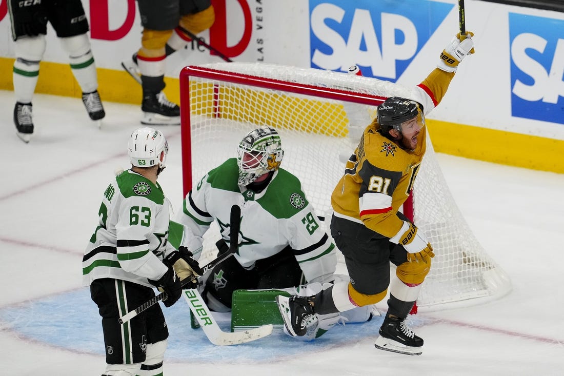 Vegas’ Jonathan Marchessault scored off a turnover by Dallas defenseman Ryan Suter to tie the score 2-2 with 2:22 left in regulation. Chandler Stephenson scored the game-winner 1:12 into overtime.