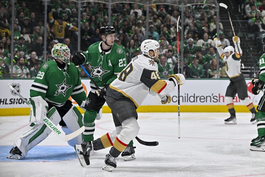 It was a storybook start for Vegas, which scored on two of its first three shots. Captain Mark Stone, playing for the first time since a lacerated spleen on Feb. 20, scored a power-play goal on a deflection after Dallas center Sam Steel was whistled for a high-sticking penalty just 26 seconds into the game.