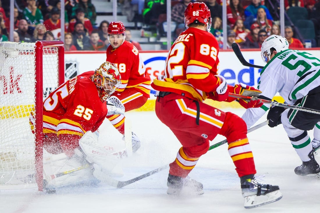 Jamie Benn scored a goal and added an assist and Jake Oettinger made 43 saves as the visiting Dallas Stars claimed a 4-3 victory over the struggling Calgary Flames on Wednesday.