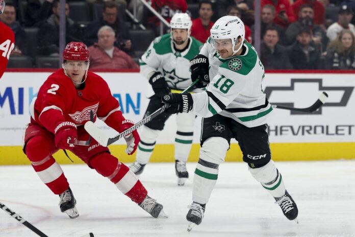 Roope Hintz had two goals and an assist and the visiting Dallas Stars scored four unanswered goals in the second period, then held off the Detroit Red Wings 5-4 on Tuesday night.