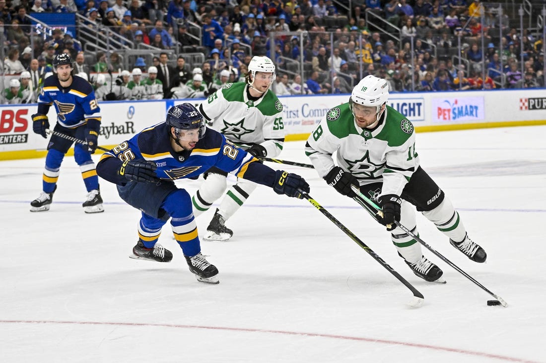 Wyatt Johnston scored twice as the visiting Dallas Stars defeated the St. Louis Blues 5-2 on Wednesday to aid their bid for the Central Division title.