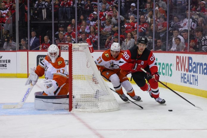 Stefan Noesen scored consecutive goals in the second period Sunday night for the host New Jersey Devils, who rode a five-goal flurry to a 6-2 win over the Anaheim Ducks in Newark, N.J.