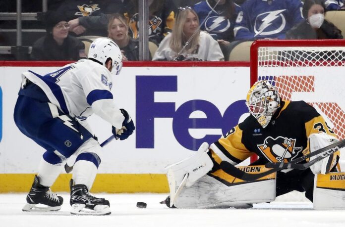 The Penguins needed a late third-period goal from former Maple Leafs forward Michael Bunting on Saturday after the Lightning overcame a 4-1 deficit to tie the game.